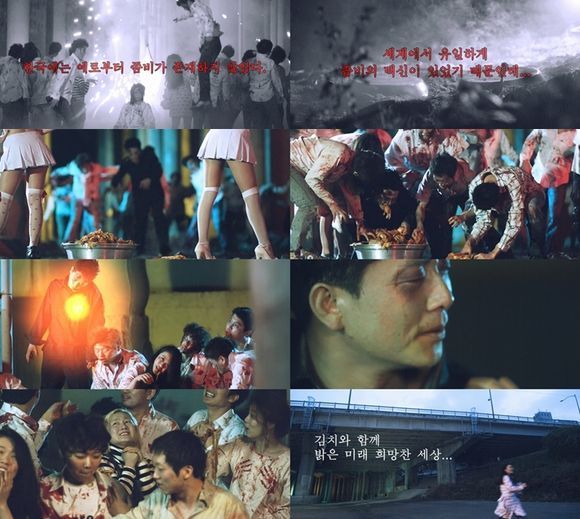 ‘한국에는 예로부터 좀비가 존재하지 않았다. 세계에서 유일하게 좀비의 백신이 있었기 때문인데..’라는 문구로 시작하는 뮤직비디오에서 좀비가 한국엔 없는 이유를 특별히 ‘김치의 유산균’ 때문이라고 밝히고 있는 것.