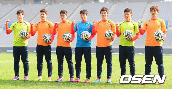 시축에 앞서 송종국, 박종우, 홍철, 서정진, 임상협, 이명주, 신화용이 포즈를 취하고 있다.