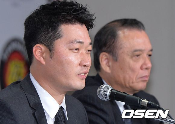 '끝판대장' 오승환이 4일 오후 서울 역삼동 리츠칼튼 호텔에서 열린 '한신 타이거즈 오승환 선수 계약 조인식'에 참석해 취재진의 질문에 답하고 있다.
