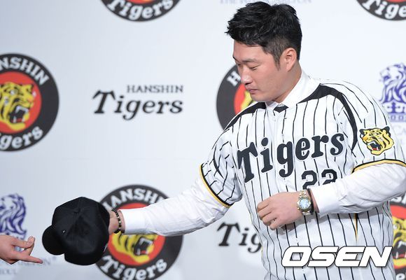 '끝판대장' 오승환이 4일 오후 서울 역삼동 리츠칼튼 호텔에서 열린 '한신 타이거즈 오승환 선수 계약 조인식'에 참석해 유니폼을 입고 기념촬영을 준비하고 있다.