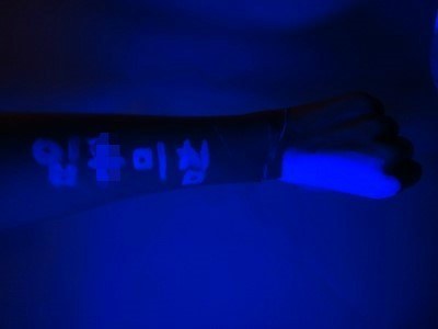 작성자는 친구와 함께 얼굴을 휴지로 얼굴을 닦아내는 것도 모자라, 화장실에서 찬물과 손비누를 이용해 세안을했다. 그러나 형광물질이 없어지기는 커면 작성자의 얼굴을 만진 친구의 손도 파랗게 빛났다고 전했다.