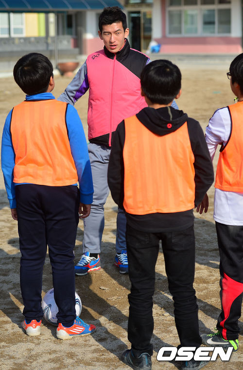 4일 오후 경상북도 상주 관내 여러 초등학교와 고등학교에서 축구로 만드는 행복 '추캥'이 봉사활동을 했다. 오장은이 축구 꿈나무들에게 축구에 대해 설명하고 있다.