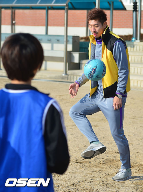4일 오후 경상북도 상주 관내 여러 초등학교와 고등학교에서 축구로 만드는 행복 '추캥'이 봉사활동을 했다. 하대성이 축구 꿈나무들에게 축구 패스에 대해 설명하며 시범을 보이고 있다.