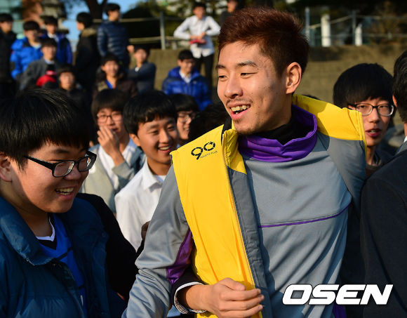 4일 오후 경상북도 상주 관내 여러 초등학교와 고등학교에서 축구로 만드는 행복 '추캥'이 봉사활동을 했다. 하대성이 꿈나무들의 포옹 세례에 환하게 웃고 있다.