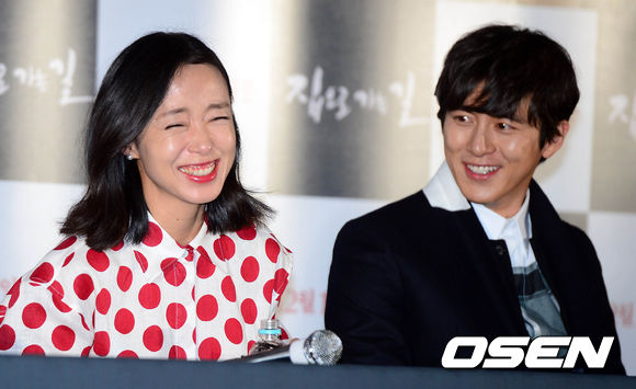 4일 오후 서울 행당동 CGV 왕십리에서 열린 영화 '집으로 가는 길' 언론배급 시사회에서 전도연과 고수가 미소를 짓고 있다.