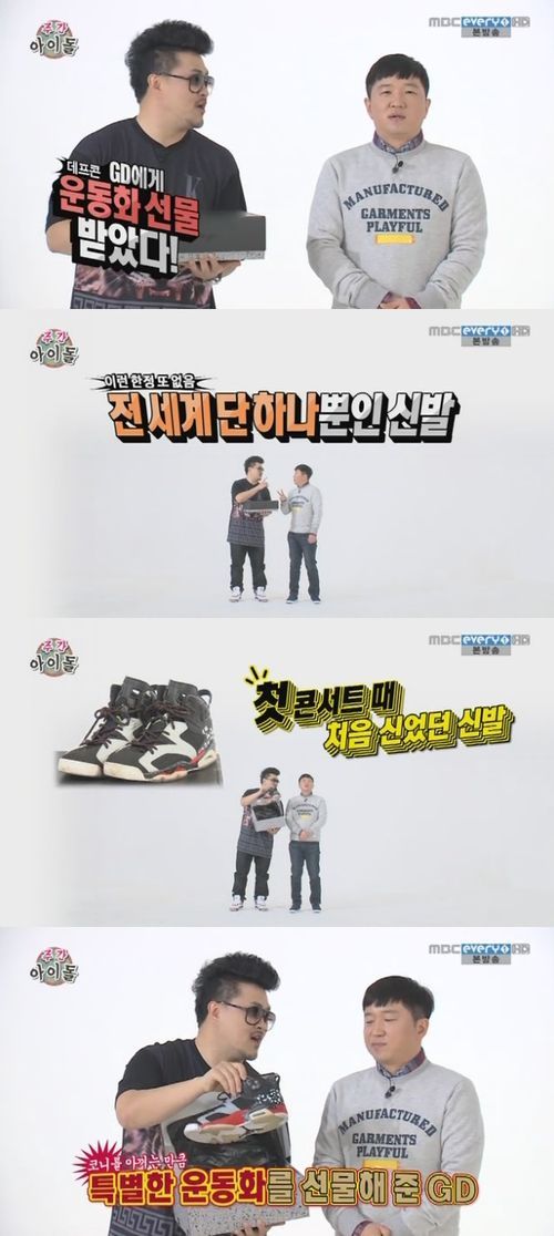 데프콘은 4일 방송된 MBC에브리원 '주간 아이돌'에서 "지드래곤이 세상에서 하나 밖에 없는 특별한 운동화를 선물 해줬다"고 밝혔다.