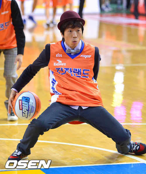4일 오후 인천 삼산월드체육관에서 열린 '2013-2014 국민카드 프로농구' 인천 전자랜드와 창원 LG의 경기에 앞서 개그맨 이광채가 시투를 하고 있다.