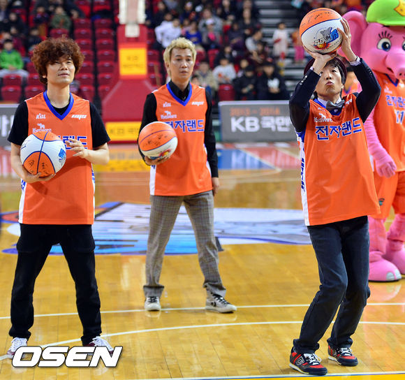4일 오후 인천 삼산월드체육관에서 열린 '2013-2014 국민카드 프로농구' 인천 전자랜드와 창원 LG의 경기에 앞서 개그맨 윤성한과 이광채가 시투를 하고 있다.