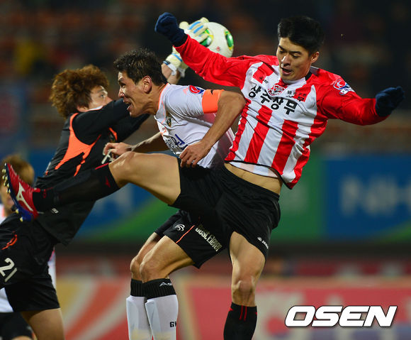4일 오후 상주시민운동장에서 현대오일뱅크 K리그 2013 승강 플레이오프 1차전 상주 상무와 강원 FC 경기, 상주 하태균이 헤딩슛을 시도하다 공중에서 강원 배효성과 충돌하며 부상을 당하고 있다.