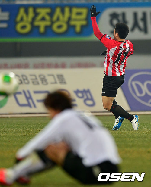 4일 오후 상주시민운동장에서 현대오일뱅크 K리그 2013 승강 플레이오프 1차전 상주 상무와 강원 FC 경기, 상주 이상협이 선제골에 성공한 후 기뻐하고 있다.