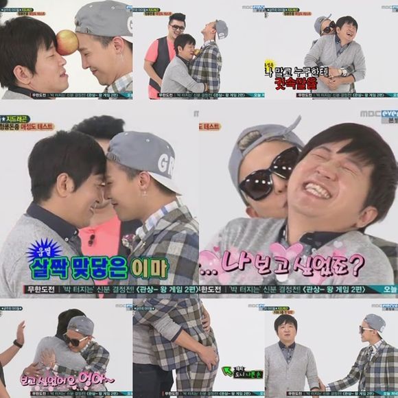마지막으로 손을 사용하지 않고 오로지 얼굴로만 사과를 배까지 옮기는 애정도 테스트를 했다. 지드래곤은 민망한 자세에 얼굴까지 빨개졌고 정형돈의 리드로 테스트를 통과, 애정을 과시했다.