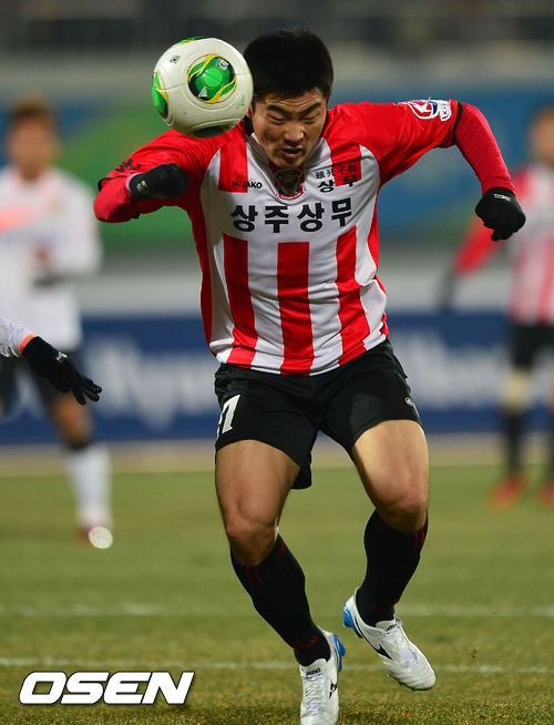 4일 오후 상주시민운동장에서 현대오일뱅크 K리그 2013 승강 플레이오프 1차전 상주 상무와 강원 FC 경기, 상주 이상협이 헤딩슛을 시도하고 있다.
