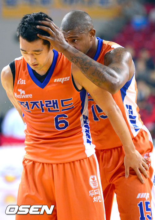 4쿼터 전자랜드 차바위가 자유투 연속2개를 놓치자 포웰이 차바위를 격려하고 있다./ soul1014@osen.co.kr