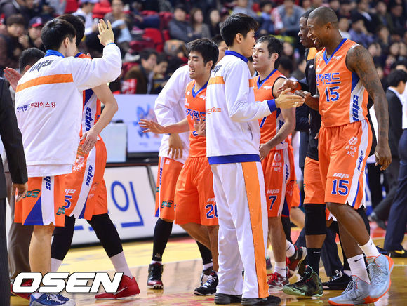 3쿼터 작전타임때 승기를 잡은 전자랜드 선수들이 하이파이브를 하고 있다./ soul1014@osen.co.kr