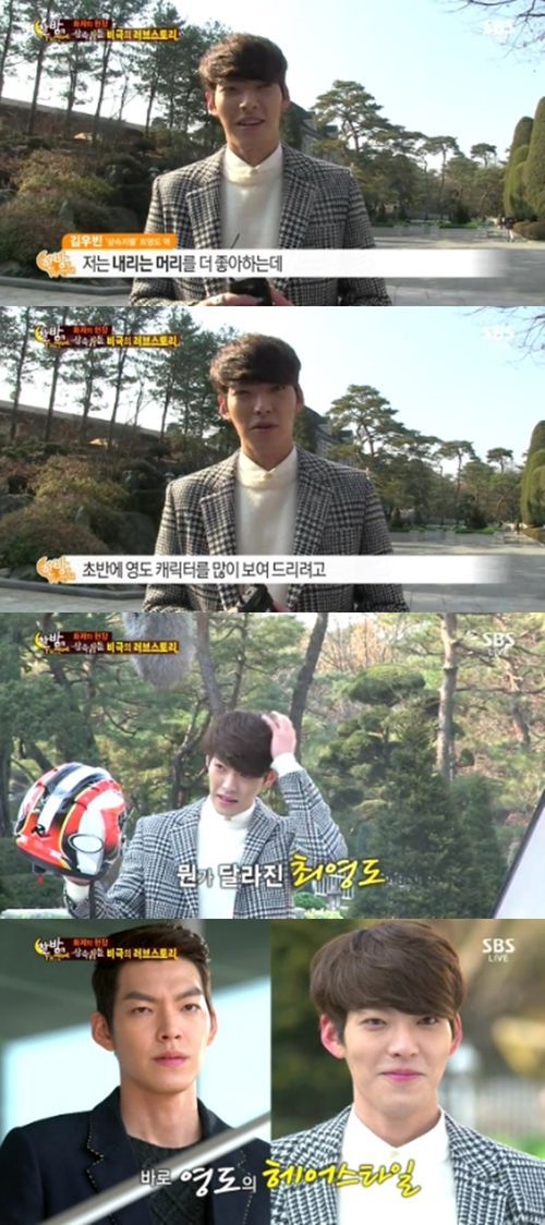 김우빈은 4일 오후 방송된 SBS 예능 프로그램 '한밤의 TV연예'에 출연해 "내리는 머리를 더 좋아하는데 초반에 영도 캐릭터를 보여드리려고 새 스타일을 했다"고 말했다.