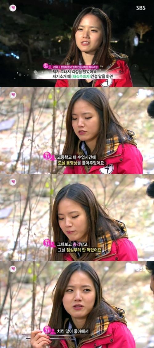 SBS 교양프로그램 '짝'에 출연한 여자3호가 도살 동영상을 본 후부터 9년째 채식 중이라고 밝혔다.