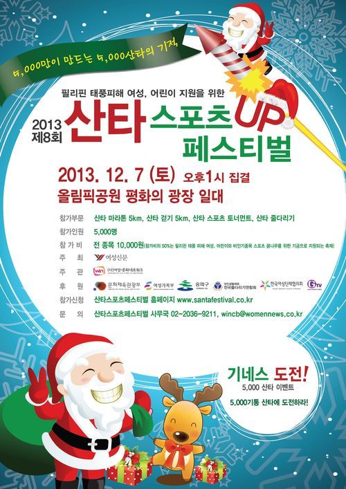 매년 수익금을 스포츠 꿈나무 장학금으로 기부하는 기부축제이기도 한 산타 스포츠 페스티벌은 올해는 특별히 참가비의 일부를 필리핀 태풍 피해지역 여성과 어린이를 위한 기금으로도 지원할 예정이다.