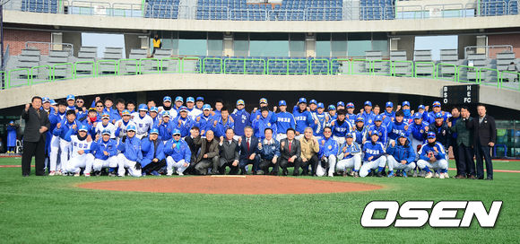 5일 오전 포항구장에서 열린 '2013 야구대제전' 포철고와 개성고의 경기에 앞서 KBA 이병석 회장및 귀빈들이 양팀 선수들과 포토타임을 갖고 있다.