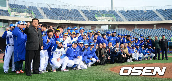 5일 오전 포항구장에서 열린 '2013 야구대제전' 포철고와 개성고의 경기에 앞서 KBA 이병석 회장및 귀빈들이 양팀 선수들과 포토타임을 갖고 있다.