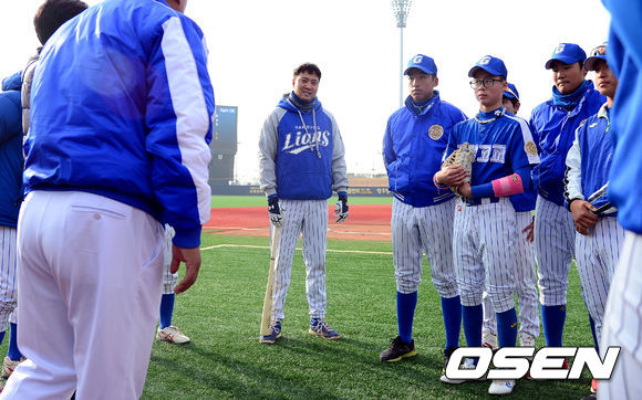 5일 오전 포항구장에서 열린 '2013 야구대제전' 포철고와 개성고의 경기에 앞서 삼성 라이온즈 채태인이 후배들과 이야기를 나누고 있다.