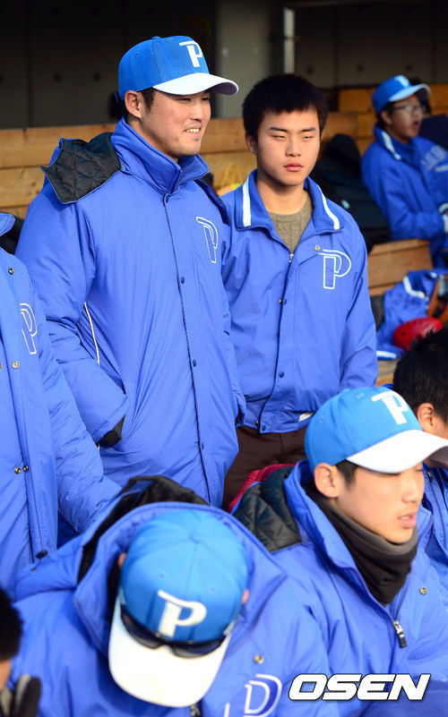 5일 오전 포항구장에서 열린 '2013 야구대제전' 포철고와 개성고의 경기, 롯데 자이언츠 박종윤이 경기를 관전하고 있다.