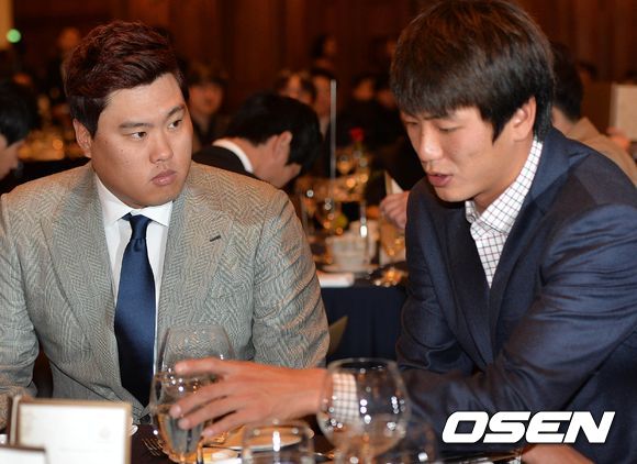 LA 다저스 류현진과 SK 김광현이 시상식 시작을 앞두고 대화를 나누고 있다.