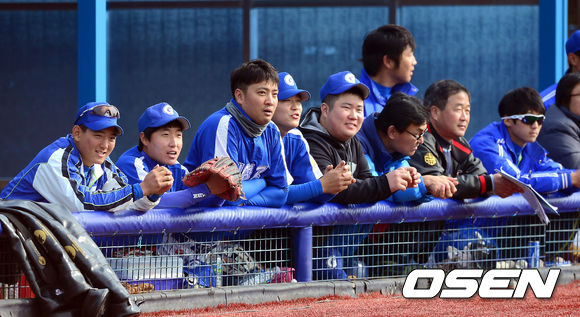 5일 오전 포항구장에서 열린 '2013 야구대제전' 포철고와 개성고의 경기, 개성고 채태인이 모교 후배들과 함께 팀을 응원하고 있다.