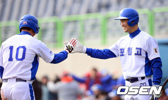5일 오전 포항구장에서 열린 '2013 야구대제전' 포철고와 개성고의 경기, 포철고 박종윤이 득점을 올린 동료와 기뻐하고 있다.