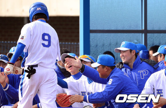 5일 오전 포항구장에서 열린 '2013 야구대제전' 포철고와 개성고의 경기, 포철고 박종윤이 득점을 올린 동료와 기뻐하고 있다.
