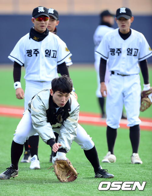 5일 오전 포항구장에서 열린 '2013 야구대제전' 동산고와 광주일고의 경기에 앞서 광주일고 서건창이 수비훈련을 하고 있다.