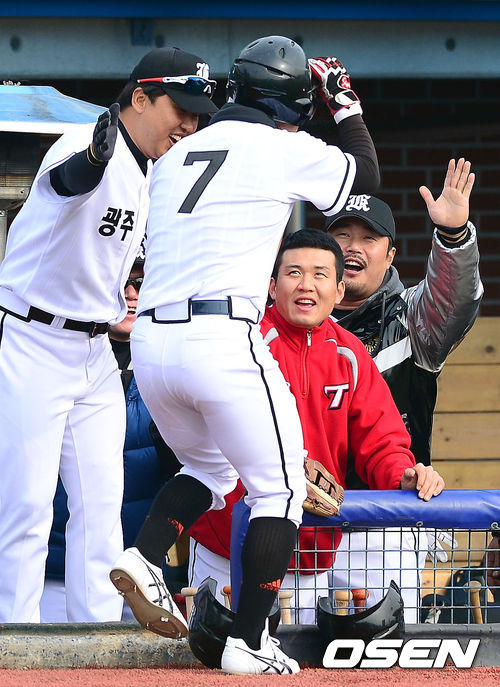 5일 오전 포항구장에서 열린 '2013 야구대제전' 동산고와 광주일고의 경기, 2회말 광주일고 강민국이 3루타를 때린 뒤 동산고 수비 실책으로 홈에 쇄도해 득점을 올린 뒤 김상훈, 신종길, 이호준과 하이파이브를 하고 있다.