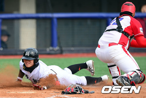 5일 오전 포항구장에서 열린 '2013 야구대제전' 동산고와 광주일고의 경기, 2회말 광주일고 강민국이 3루타를 때린 뒤 동산고 수비 실책으로 홈에 쇄도해 득점을 올리고 있다.