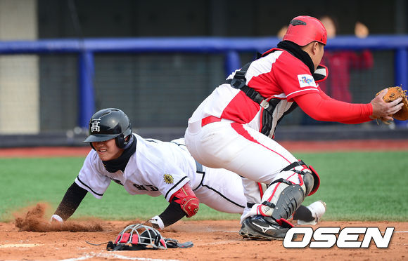 5일 오전 포항구장에서 열린 '2013 야구대제전' 동산고와 광주일고의 경기, 2회말 광주일고 강민국이 3루타를 때린 뒤 동산고 수비 실책으로 홈에 쇄도해 득점을 올리고 있다.