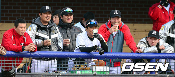 5일 오전 포항구장에서 열린 '2013 야구대제전' 동산고와 광주일고의 경기, 광주일고 출신 선수들이 경기를 바라보며 미소를 짓고 있다.