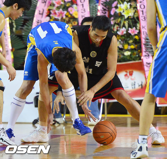 5일 오후 경북 김천실내체육관에서 열린 '2013 KB국민은행 농구대잔치' 남자부 결승전 연세대와 상무의 경기, 1쿼터 연세대 박인태와 상무 김현민이 볼다툼을 하고 있다.