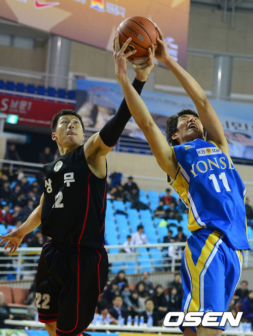 5일 오후 경북 김천실내체육관에서 열린 '2013 KB국민은행 농구대잔치' 남자부 결승전 연세대와 상무의 경기, 2쿼터 상무 이정현과 연세대 박인태가 리바운드 대결을 펼치고 있다.