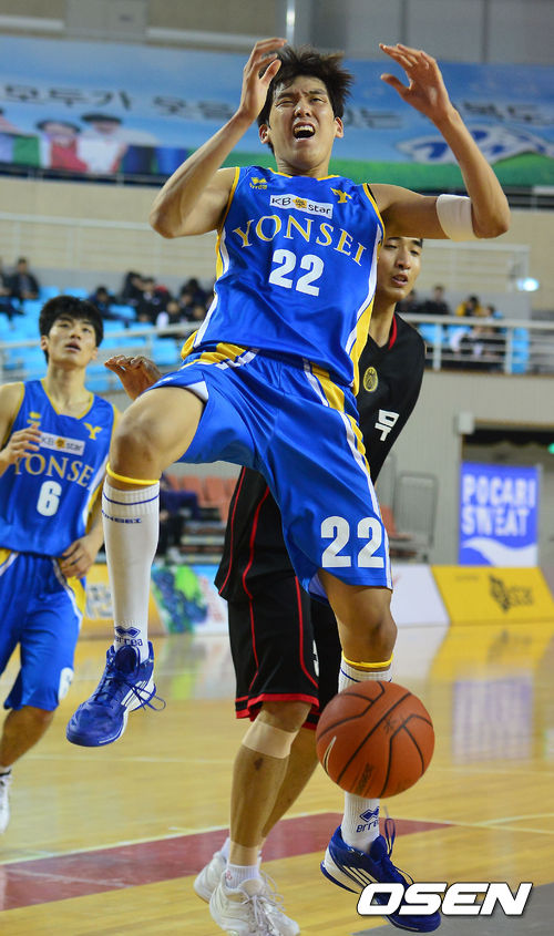 5일 오후 경북 김천실내체육관에서 열린 '2013 KB국민은행 농구대잔치' 남자부 결승전 연세대와 상무의 경기, 4쿼터 연세대 최준용이 골밑 슛 도중 파울을 당하고 있다.