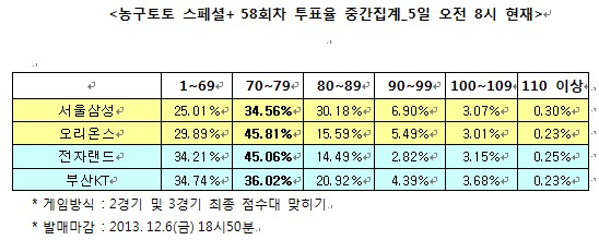 2013-14시즌 KBL 2경기 대상 농구토토 스페셜+ 58회차 투표율 중간집계 결과