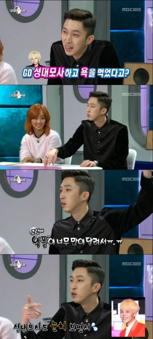 그는 "당시 출연했을 때 내가 받은 질문이 딱 2개였다. 하나는 전 여자친구, 다른 것이 성대모사였다"라며 "그 때 지드래곤 씨 성대모사를 했다. 지드래곤이 걸그룹 소녀시대의 'Gee'를 만난 것을 했는데 그 때 악플이 (많이 달렸다)"라고 자신이 없는 모습을 보였다.