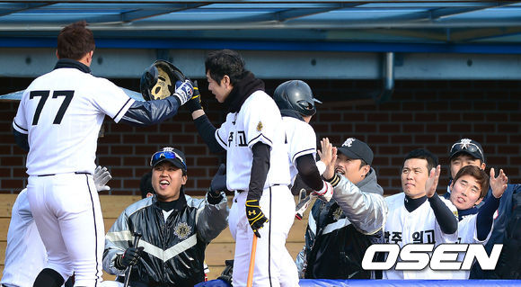5일 오전 포항구장에서 열린 '2013 야구대제전' 동산고와 광주일고의 경기, 광주일고 김상훈, 이호준, 신종길, 허경민이 득점을 올리고 더그아웃으로 들어오는 후배들과 하이파이브를 하고 있다.
