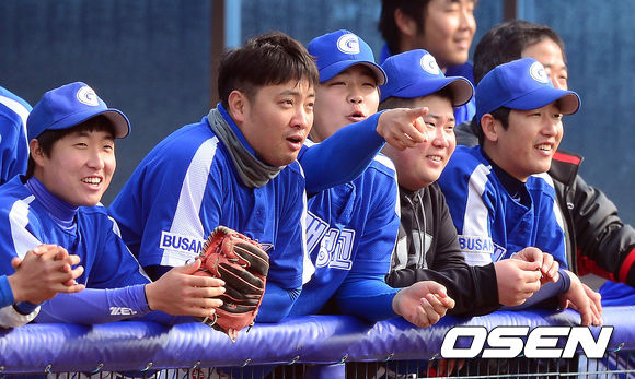 5일 오전 포항구장에서 열린 '2013 야구대제전' 포철고와 개성고의 경기, 개성고 채태인이 포철고 김희걸이 마무리 투수로 마운드 오르자 김희걸에게 이야기를 하고 있다.