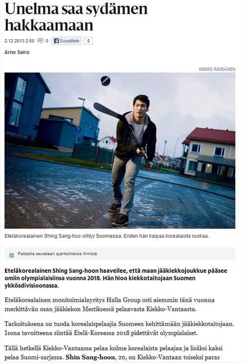 이 신문은 '꿈이 당신의 심장을 뛰게 한다(Unelma saa sydamen hakkaamaan)'는 제하의 기사로 2018년 평창 동계 올림픽을 겨냥한 신상훈과 한국 아이스하키의 도전을 상세히 소개했다.