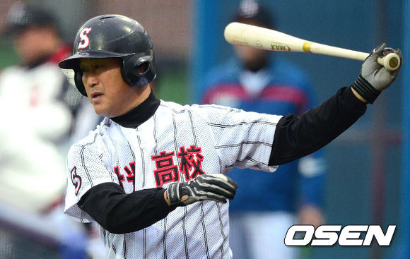 5일 오후 포항구장에서 열린 '2013 야구대제전' 세광고와 휘문고의 경기, 세광고 4번타자 장종훈이 대기타석에서 몸을 풀고 있다.