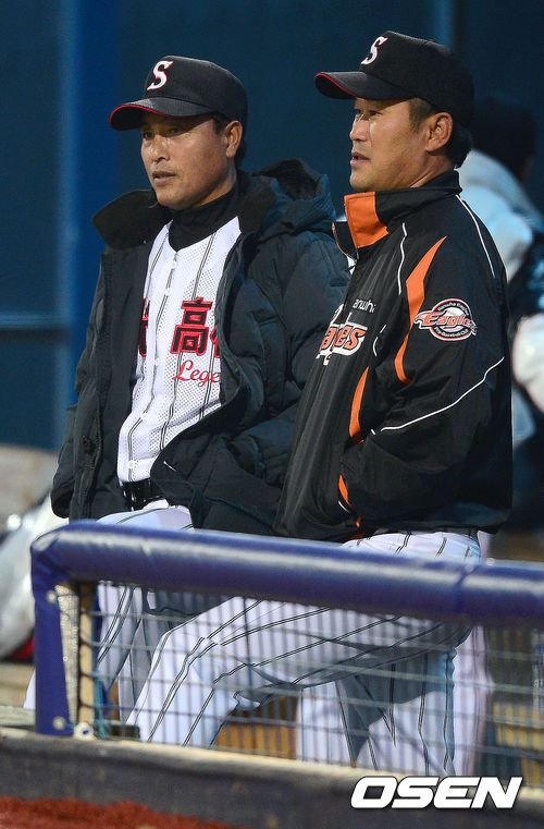 5일 오후 포항구장에서 열린 '2013 야구대제전' 세광고와 휘문고의 경기, 세광고 송진우와 장종훈이 경기를 관전하고 있다.