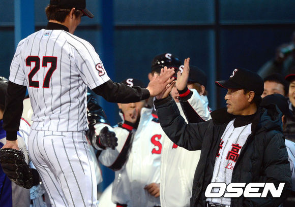 5일 오후 포항구장에서 열린 '2013 야구대제전' 세광고와 휘문고의 경기, 세광고 송진우가 이닝을 마치고 더그아웃으로 들어오는 김선기(시애틀)와 하이파이브를 하고 있다.