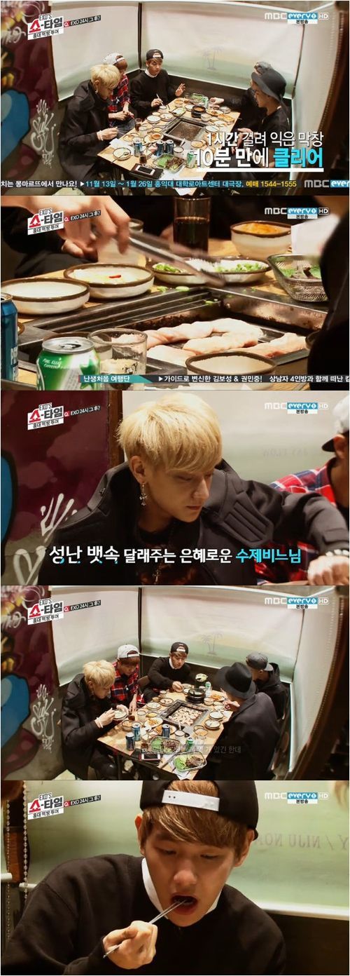 엑소는 5일 방송된 MBC에브리원 예능프로그램 ‘엑소의 쇼타임’ 2회에서 홍대 나들이를 떠난 후 식당에 들러 밥을 먹었다.