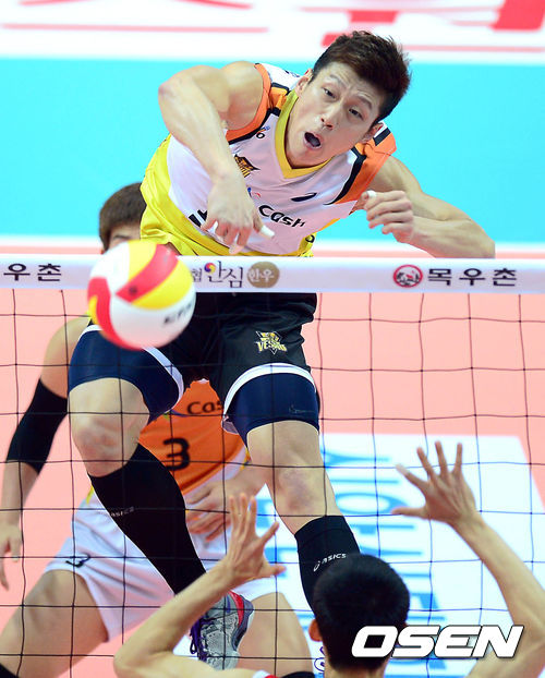 1세트 러시앤캐시 송명근이 LIG의 블로킹 벽을 피해 공격을 시도하고 있다.