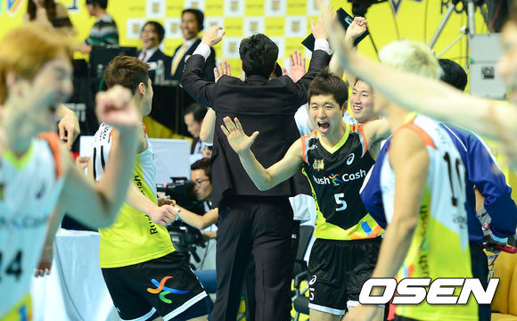 김세진 감독이 지휘하는 러시앤캐시는 5일 안산상록수체육관에서 열린 NH농협 2013-2014시즌 V리그 남자부 2라운드 LIG손해보험과 경기서 세트스코어 3-0(25-19, 25-23, 25-18) 완승을 거뒀다. 이날 승리는 러시앤캐시의 창단 첫 승. 1승 8패(승점 5)로 여전히 최하위에 머물러있지만 그동안 간절히 바랐던 승리의 테이프를 끊었다는 점에서 러시앤캐시에는 의미가 깊은 승리였다.