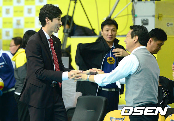 경기 종료 후 러시앤캐시 김세진 감독이 첫 승 후 최윤 구단주의 축하를 받고 있다./sunday@osen.co.kr