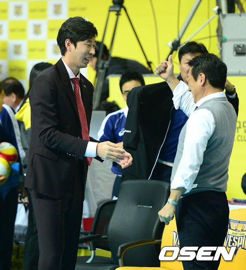경기 종료 후 러시앤캐시 김세진 감독이 첫 승 후 최윤 구단주의 축하를 받고 있다./sunday@osen.co.kr